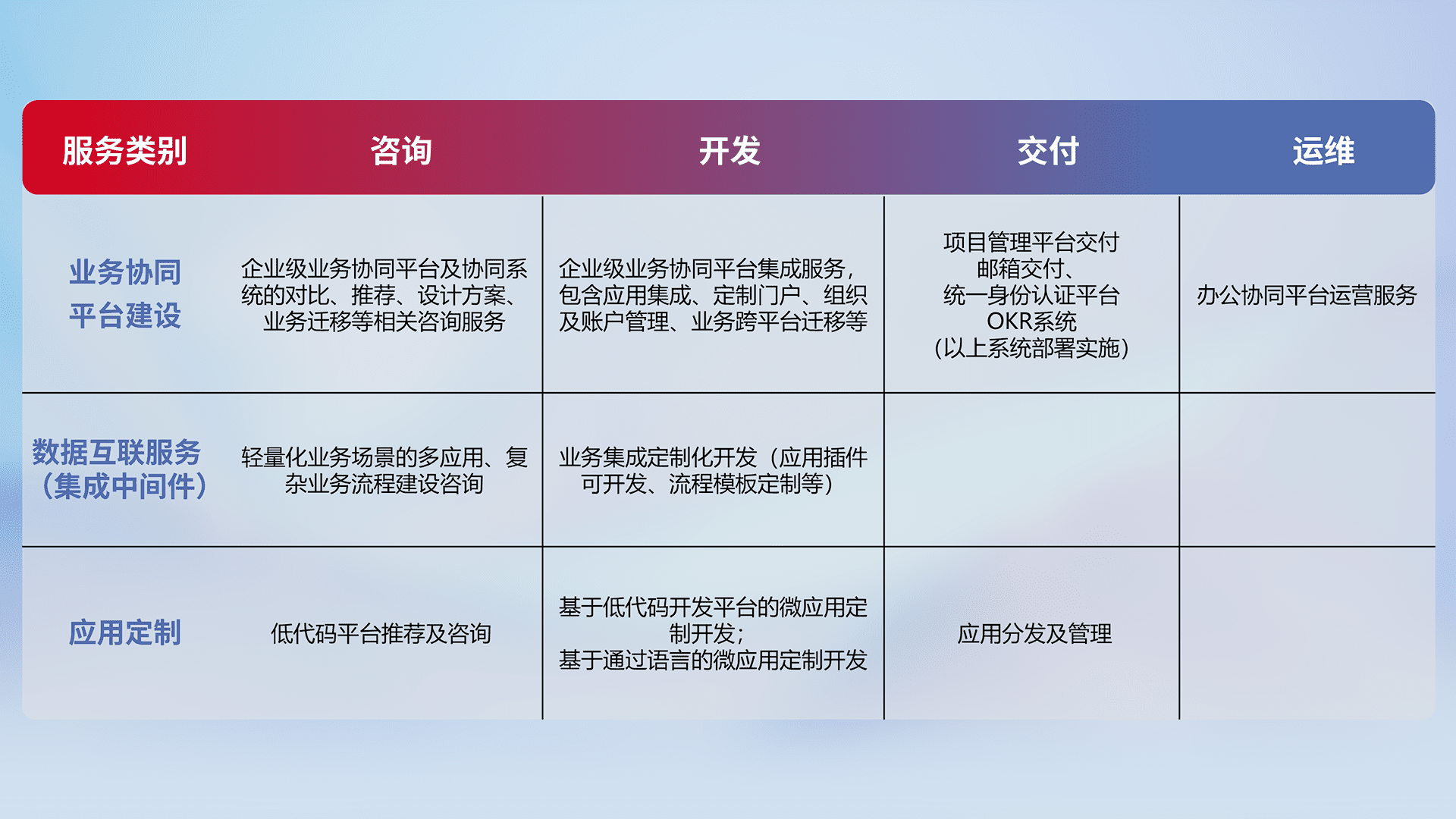 针对钉钉、、、、企微、、IDaas等平台级产品提供产品的规划、、方案、、、、交付、、定制化开发等服务,,,,实现如统一协同办公、、、、智能客户服务、、、、混合会议管理、、、、智能数据查询、、、、等业务场景,,,,实现数字化转型。。