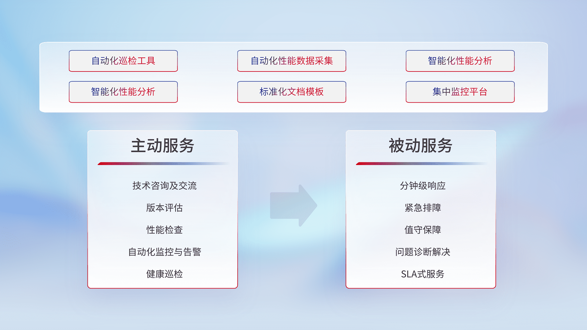 智能化工具和标准化文档,,,,保障服务质量,,提供主动服务(包含技术咨询、、、、版本评估、、、性能检查、、、、自动化监控与告警、、、、健康巡检)和被动服务包含(分钟级响应、、紧急排障、、、、值守保障、、问题诊断解决、、、、SLA服务)。。